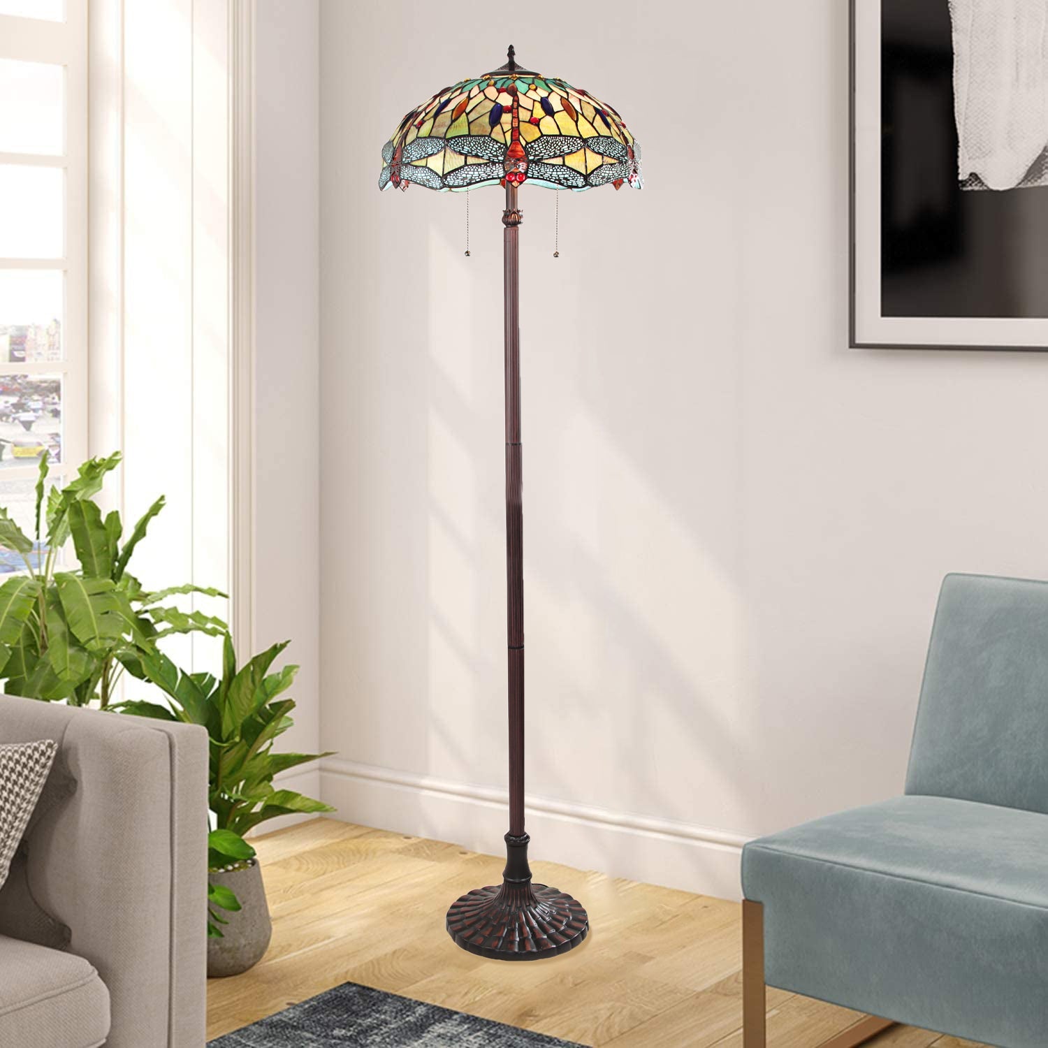 EMPRESS, a Dragonfly downward floor lamp, will make a design statement by itself. Expand the effect by adding one or more of the other lamps in this design style. Expertly handcrafted with top quality materials including real stained glass, sparkling crystals and gem-like cabochons. The resin base and metal pole are finished in an antique bronze patina.